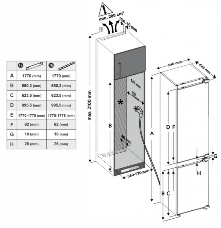 холодильник-морозильник встраиваемый, 243 л, класс энергопотребления А+, ручная система размораживания, 54х54,5х177 см