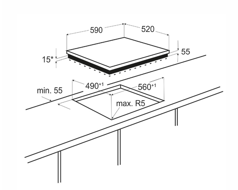 Характер огранки фаски на внешней стороне варочной панели. Металлические рамки предотвращают забивание монтажных швов крошками и пылью.