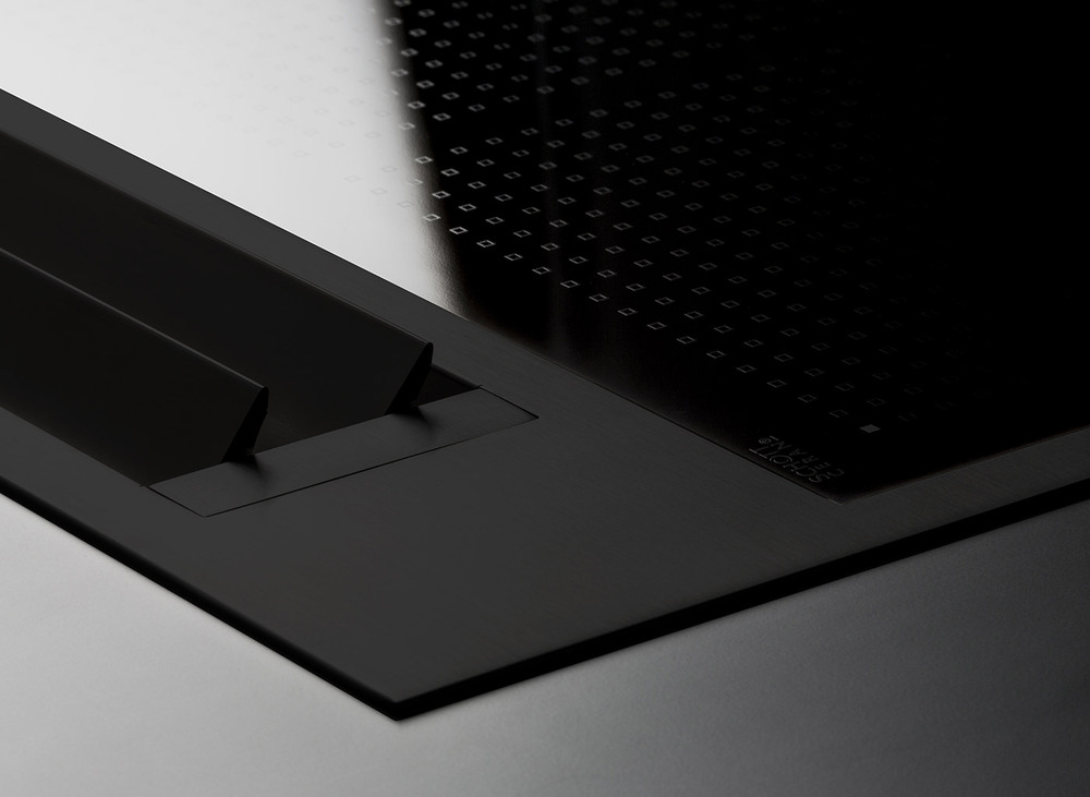 Характер огранки фаски на внешней стороне варочной панели. Металлические рамки предотвращают забивание монтажных швов крошками и пылью.