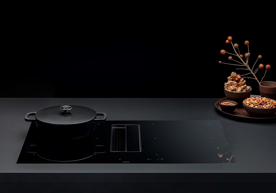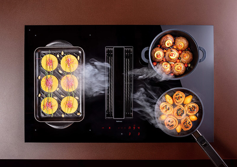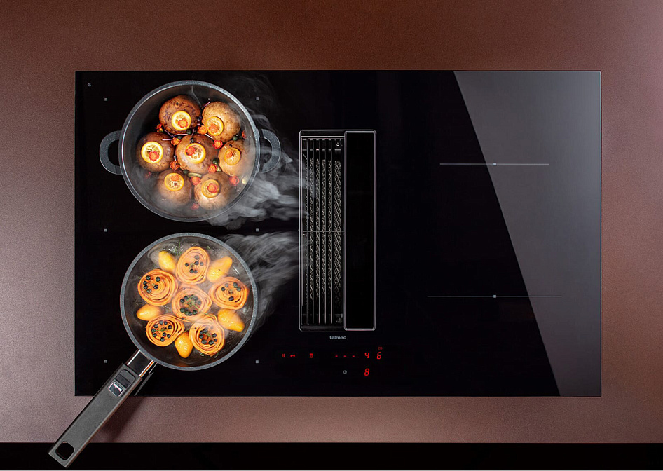Модели со встроенной вытяжкой подходят для компактных кухонь. Запахи, пар и дым от готовки полностью поглощаются встроенной вытяжкой.