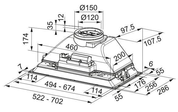 вытяжка встраиваемая в подвесной шкаф, 52 см, 650 м3/ч, нержавеющая сталь