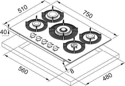 поверхность газовая, 75 см, газ на стекле, 5 конфорок, чугунные решетки, черный
