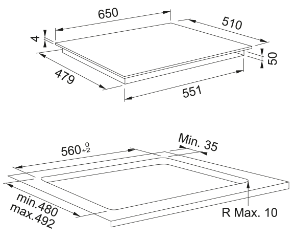 Характер огранки фаски на внешней стороне варочной панели. Металлические рамки предотвращают забивание монтажных швов крошками и пылью.