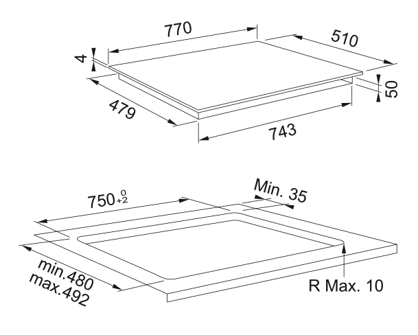 Характер огранки фаски на внешней стороне варочной панели. Металлические рамки предотвращают забивание монтажных швов крошками и пылью.