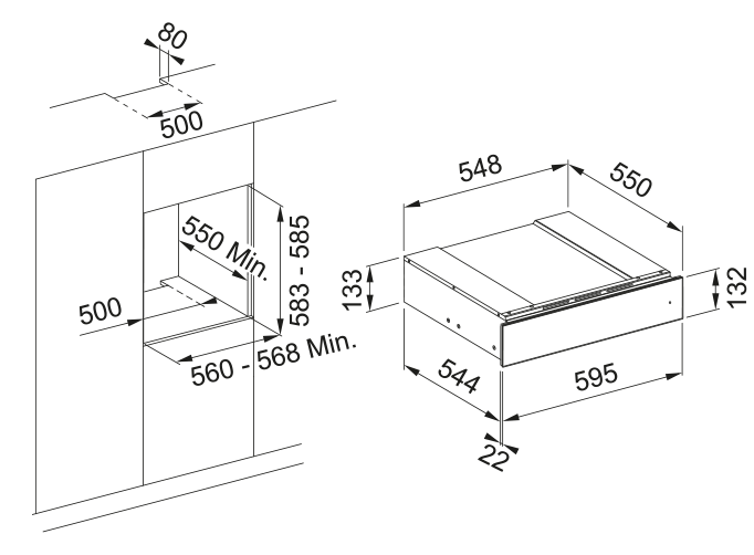 ящик для подогрева посуды встраиваемый, 59,5х55х13,2 см, черное стекло