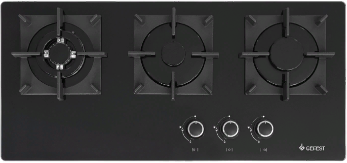 поверхность газовая, 75 см, газ на стекле, 3 конфорки, решетки чугунные, черный