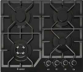 поверхность газовая, 60 см, газ на стекле, 4 конфорки, чугунные решетки, черный