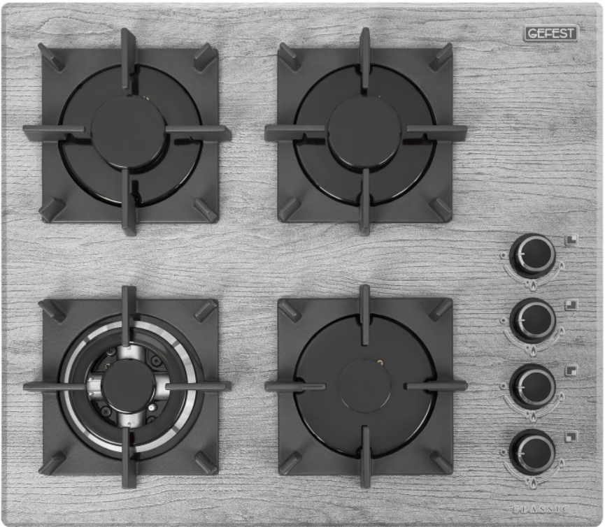 поверхность газовая, 60 см, газ на стекле, 4 конфорки, решетки чугунные, серый с рисунком "дерево"