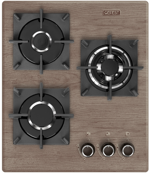 поверхность газовая, 45 см, газ на стекле, 3 конфорки, решетки чугунные, коричневый с рисунком "дерево"