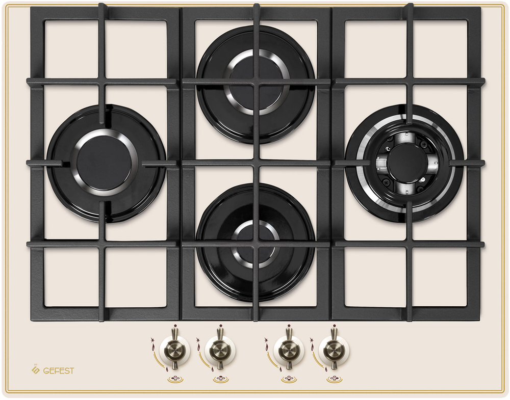 поверхность газовая, 67 см, газ на стекле, 4 конфорки, решетки чугунные, кремовый