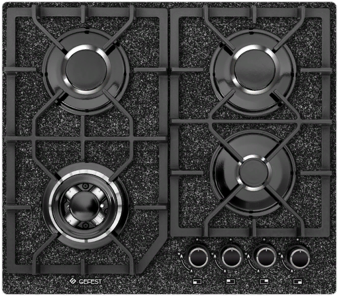 поверхность газовая, 60 см, газ на стекле, 4 конфорки, чугунные решетки, черный с рисунком "камень"