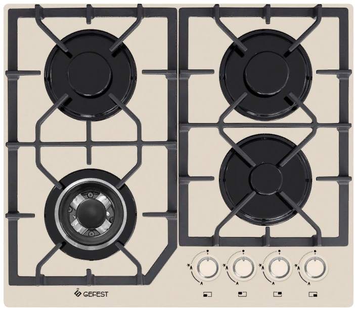 поверхность газовая, 60 см, газ на стекле, 4 конфорки, чугунные решетки, кремовый