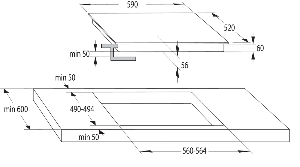 Характер огранки фаски на внешней стороне варочной панели. Металлические рамки предотвращают забивание монтажных швов крошками и пылью.