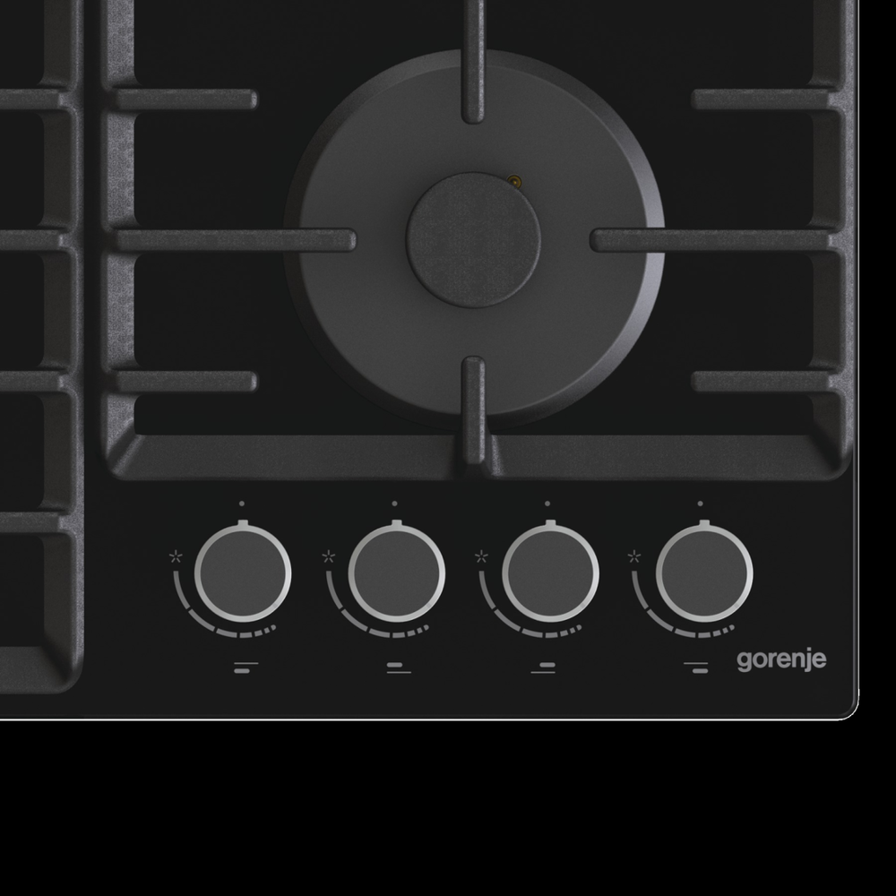 поверхность газовая, 60 см, газ на стекле, 4 конфорки, чугунные решетки, черный