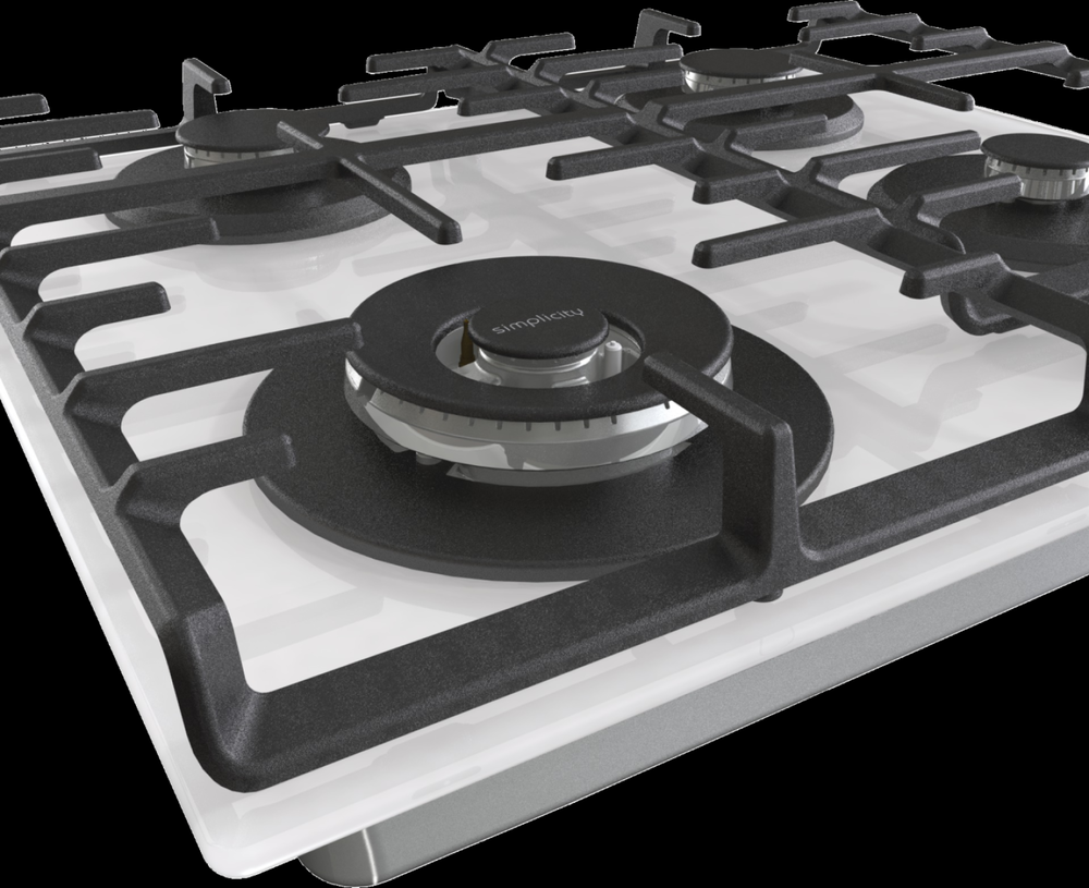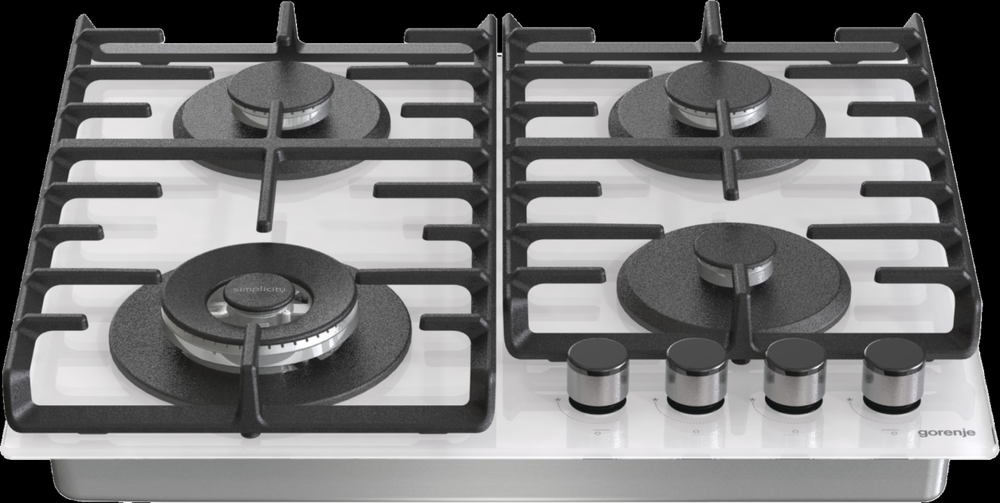 поверхность газовая, 60 см, газ на стекле. 4 конфорки, решетки чугунные, белый