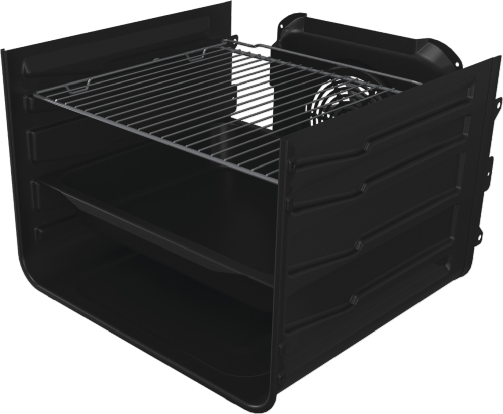 Предполагает наличие встроенного вентилятора, который обеспечивает равномерное запекание благодаря непрерывной циркуляции горячего воздуха.