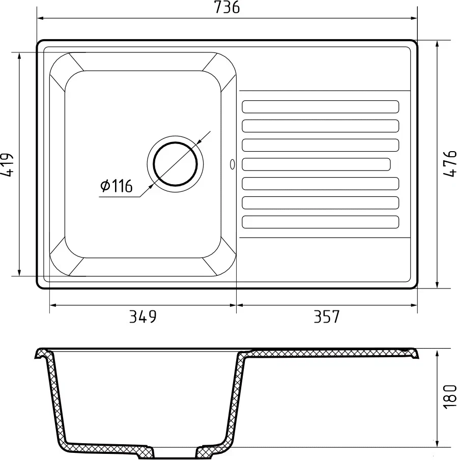 Расстояние от дна до верхней кромки чаши мойки. Оптимальная глубина — 15-18 см. Чем глубже мойка, тем меньше брызг попадет наружу.