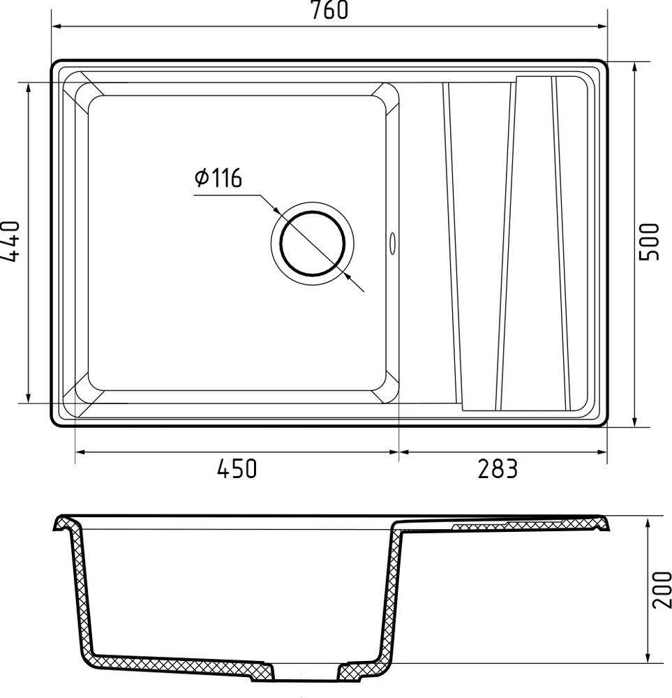 Расстояние от дна до верхней кромки чаши мойки. Оптимальная глубина — 15-18 см. Чем глубже мойка, тем меньше брызг попадет наружу.
