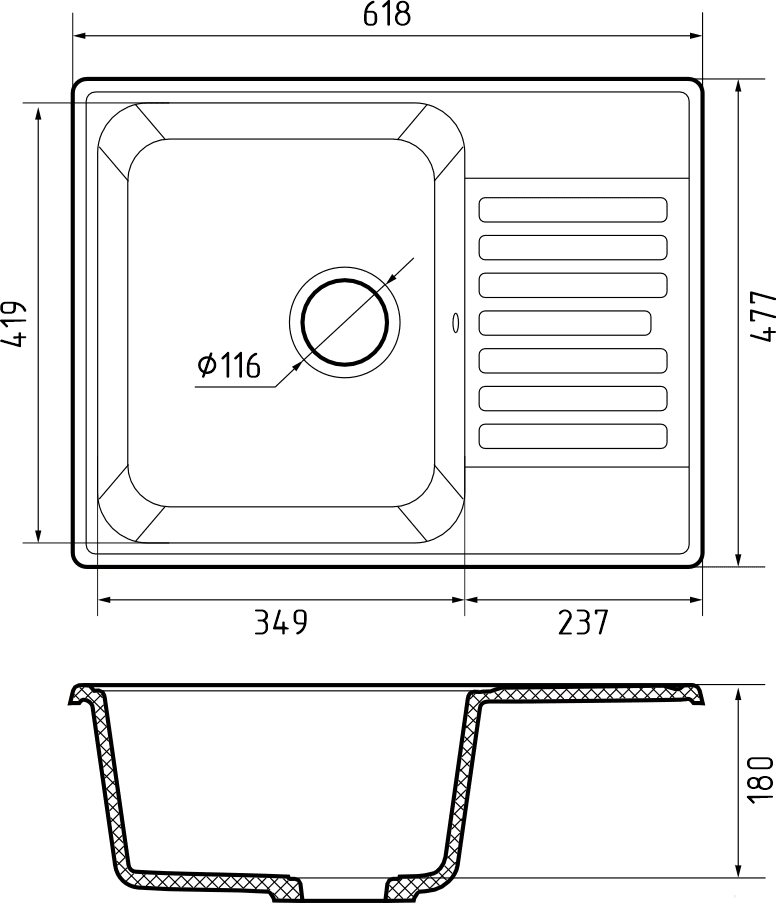 Расстояние от дна до верхней кромки чаши мойки. Оптимальная глубина — 15-18 см. Чем глубже мойка, тем меньше брызг попадет наружу.