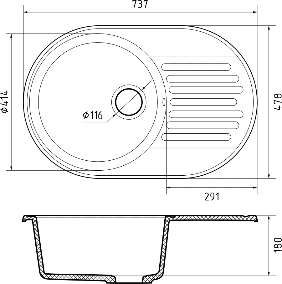 мойка, гранит, 737х478 мм, темно-серый, без сифона