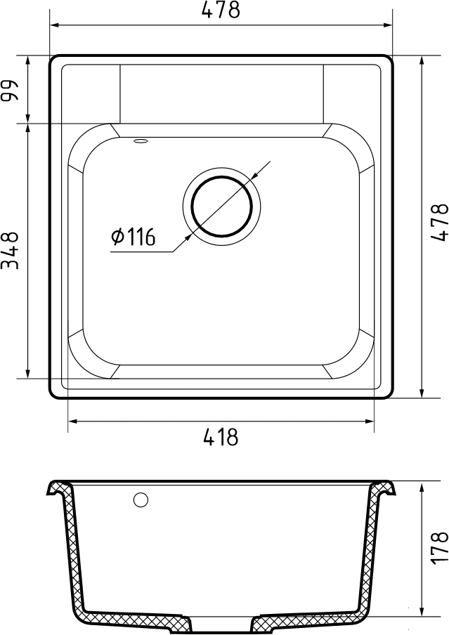 мойка, гранит, 478х478 мм, темно-серый, без сифона