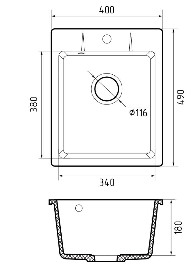 Расстояние от дна до верхней кромки чаши мойки. Оптимальная глубина — 15-18 см. Чем глубже мойка, тем меньше брызг попадет наружу.