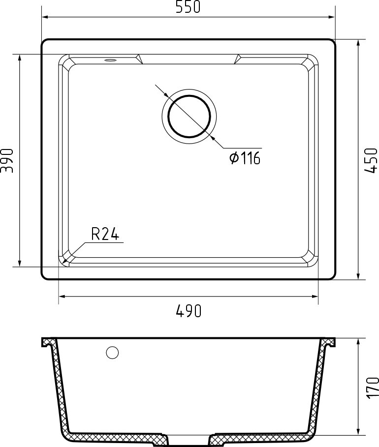 Расстояние от дна до верхней кромки чаши мойки. Оптимальная глубина — 15-18 см. Чем глубже мойка, тем меньше брызг попадет наружу.