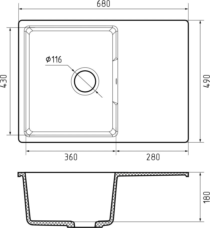 Расстояние от дна до верхней кромки чаши мойки. Оптимальная глубина — 15-18 см. Чем глубже мойка, тем меньше брызг попадет наружу.