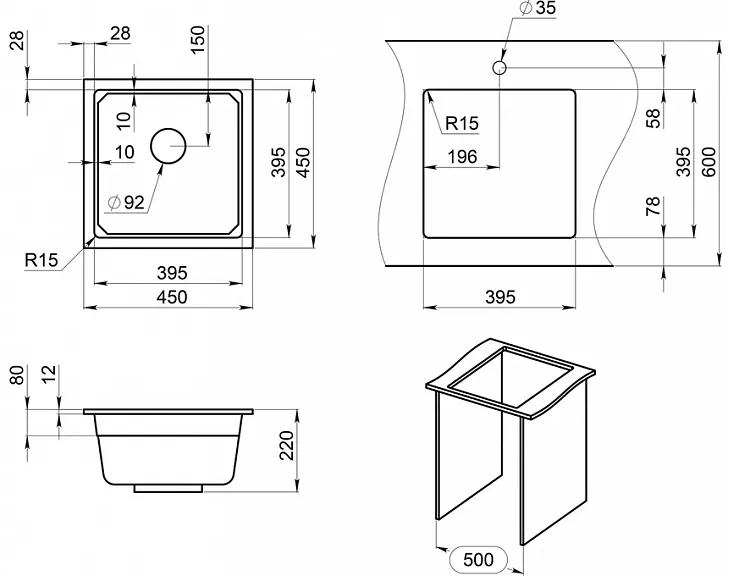 мойка, гранит, 450х450 мм, алюминиум, комплектация- металлический сифон, ролл-мат и дозатор