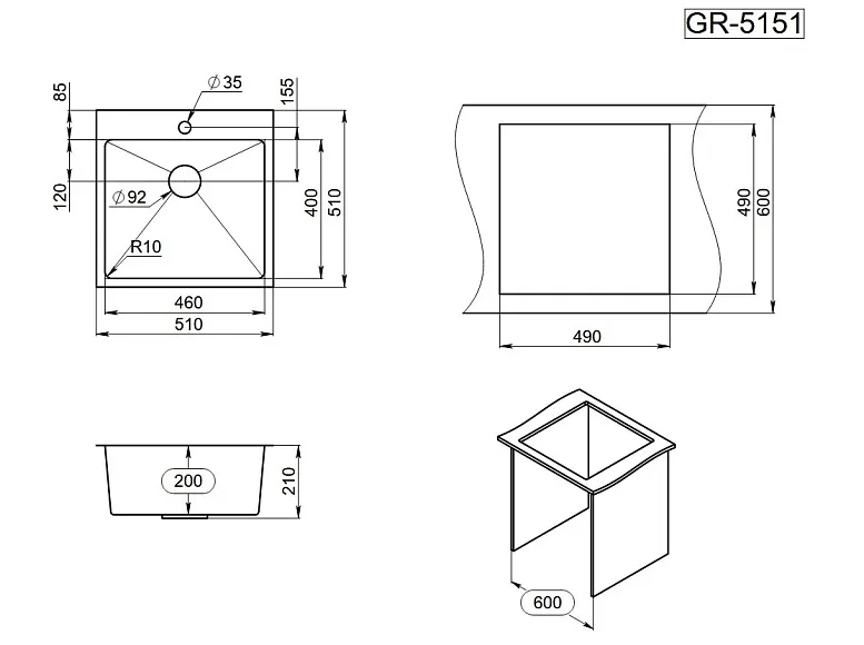 мойка, нержавеющая сталь, 510х510 мм, графит матовый