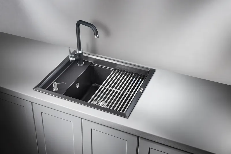 мойка, гранит, 600х510 мм, шварц, комплектация- металлический сифон, ролл-мат и дозатор