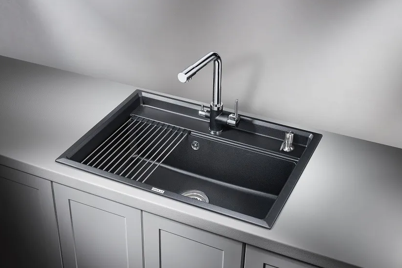 мойка, гранит, 730х510 мм, шварц, комплектация- металлический сифон, ролл-мат и дозатор