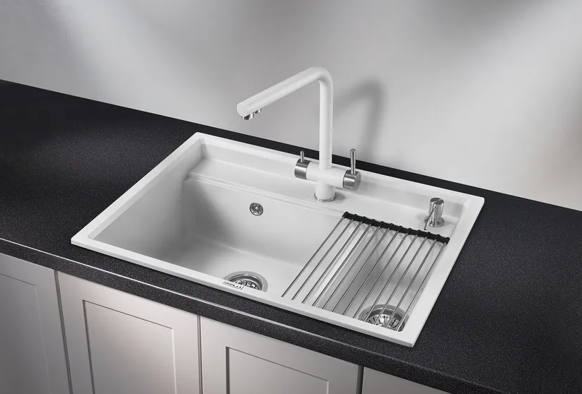 мойка, гранит, 730х510 мм, арктик (белый), комплектация- металлический сифон, ролл-мат и дозатор