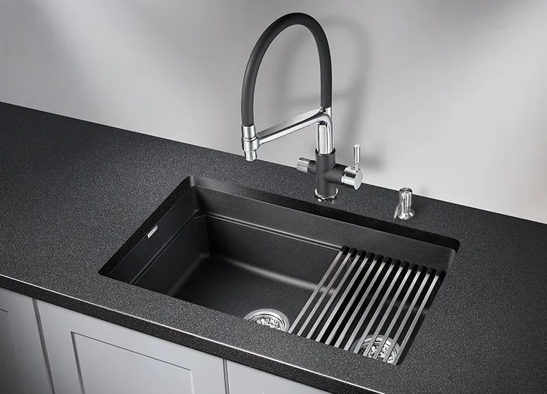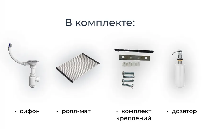мойка, гранит, 730х450 мм, черный, комплектация- металлический сифон, ролл-мат и дозатор