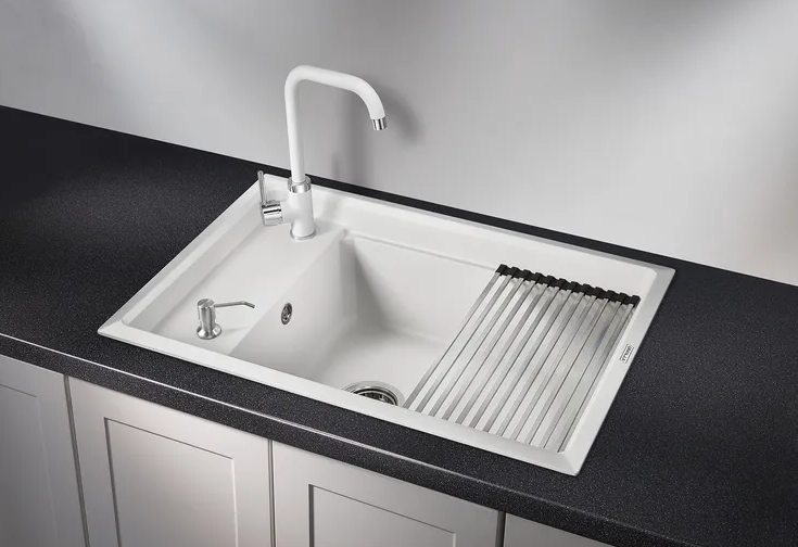 мойка, гранит, 730x510 мм, арктик (белый), комплектация- металлический сифон, ролл-мат и дозатор