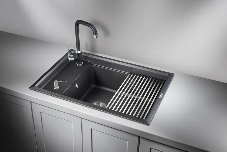 мойка, гранит, 730x510 мм, черный, комплектация- металлический сифон, ролл-мат и дозатор