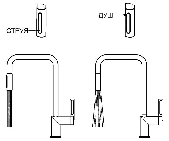 Встроенная в кран насадка на длинном гибком шланге с металлической оплеткой. Насадки с кнопкой могут переключать обычный излив воды на душ.
