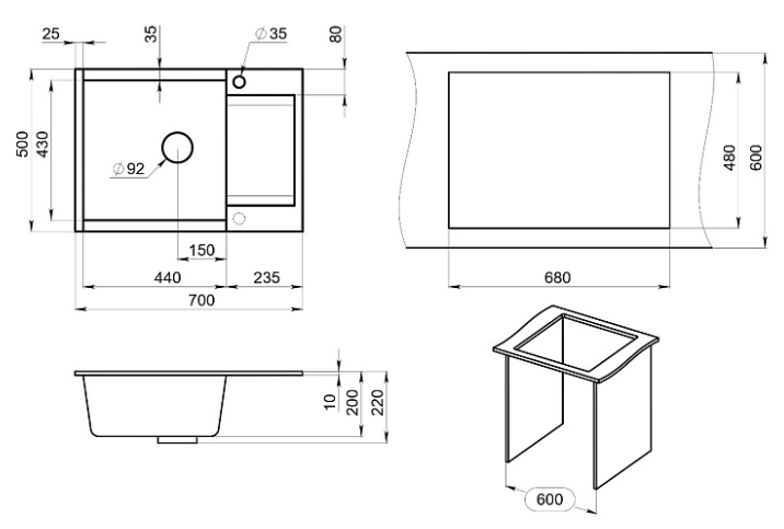 мойка, гранит, 700х500 мм, алюминиум