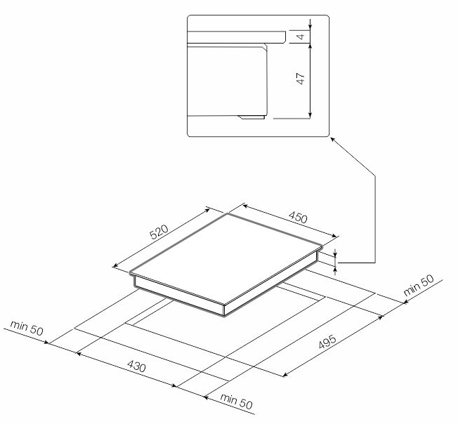 Характер огранки фаски на внешней стороне варочной панели. Металлические рамки предотвращают забивание монтажных швов крошками и пылью.