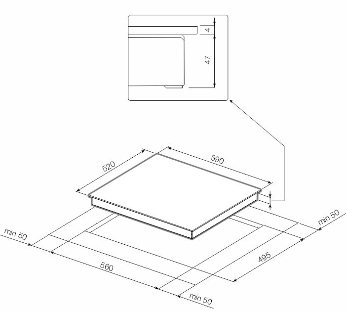 Характер огранки фаски на внешней стороне варочной панели. Металлические рамки предотвращают забивание монтажных швов крошками и пылью.