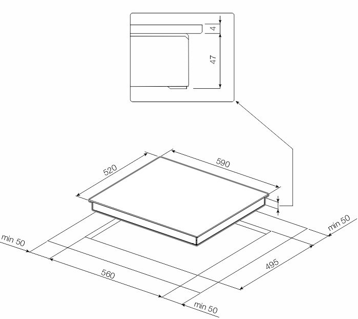 Характер огранки фаски на внешней стороне варочной панели. Металлические рамки предотвращают забивание монтажных швов крошками и пылью.