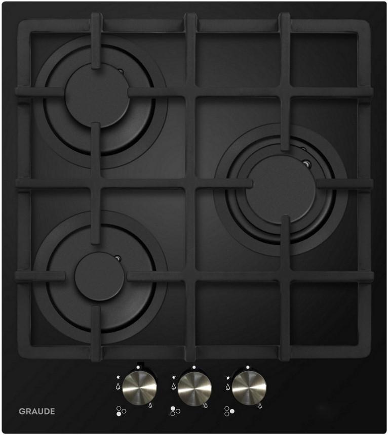 поверхность газовая, 45 см, газ на стекле, 3 конфорки, решетки чугунные, черный