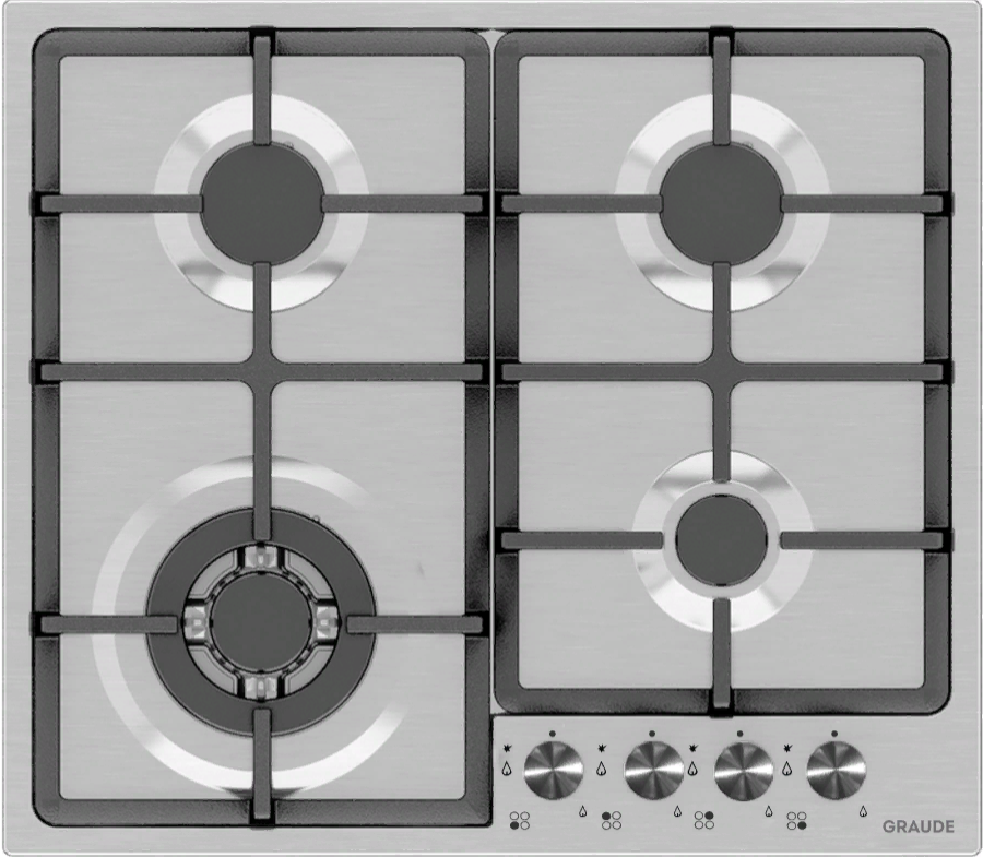 поверхность газовая, 60 см, газ на металле, 4 конфорки, решетки чугунные, нержавеющая сталь