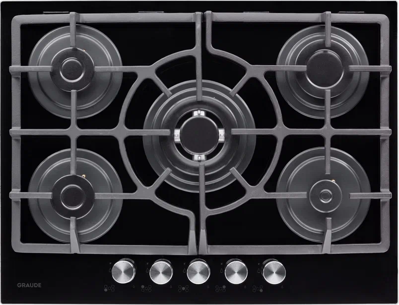 поверхность газовая, 70 см, газ на стекле, 5 конфорок, решетки чугунные, черное стекло