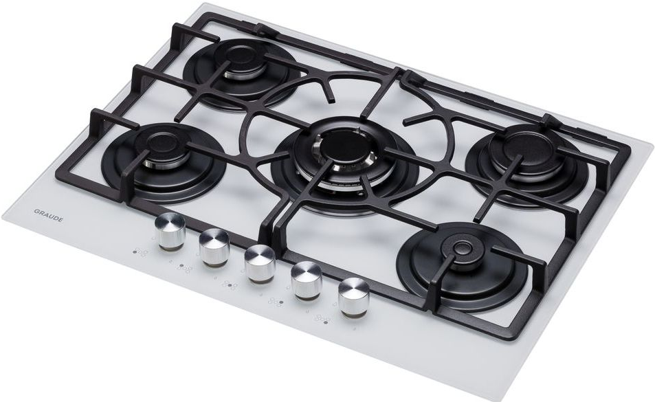 поверхность газовая, 70 см, газ на стекле, 5 конфорок, решетки чугунные, белый