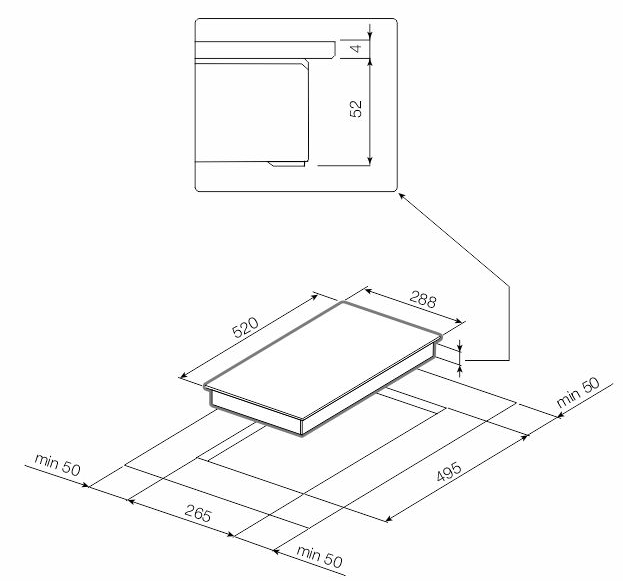 Характер огранки фаски на внешней стороне варочной панели. Металлические рамки предотвращают забивание монтажных швов крошками и пылью.