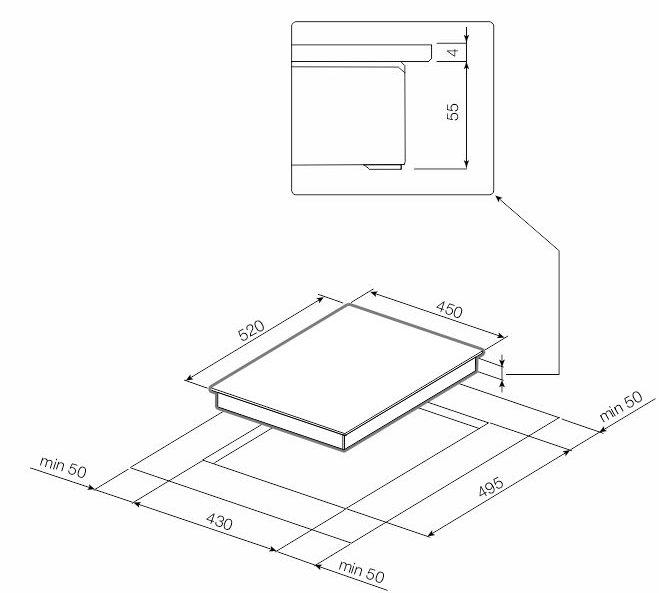 Характер огранки фаски на внешней стороне варочной панели. Металлические рамки предотвращают забивание монтажных швов крошками и пылью.