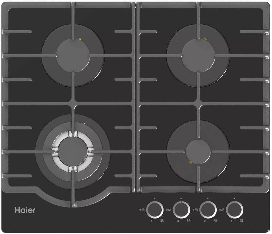 поверхность газовая, 60 см, газ на стекле, 4 конфорки, чугунные решетки, черный