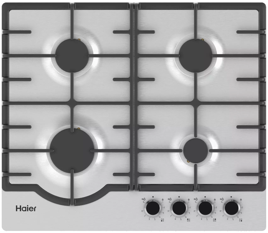 поверхность газовая, 60 см, газ на металле, 4 конфорки, чугунные решетки, нержавеющая сталь