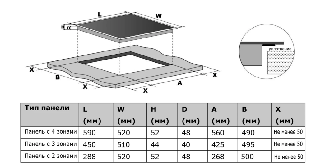 Характер огранки фаски на внешней стороне варочной панели. Металлические рамки предотвращают забивание монтажных швов крошками и пылью.